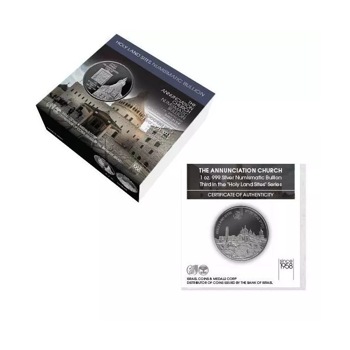 Awers ukazuje wieżę "Bazyliki Zwiastowania", drzwi ze scenami biblijnymi i napis "THE ANNUCIATON CHURCH". Na awersie umieszczono informacje o roku, czystości i wadze kruszcu zapisane po hebrajsku, angielsku.