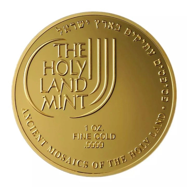 Rewers przedstawia logo "The Holy Land Mint" i napis "ANCIENT MOSAICS OF THE HOLY LAND". Rewers zawiera również informacje o czystości i wadze kruszcu.