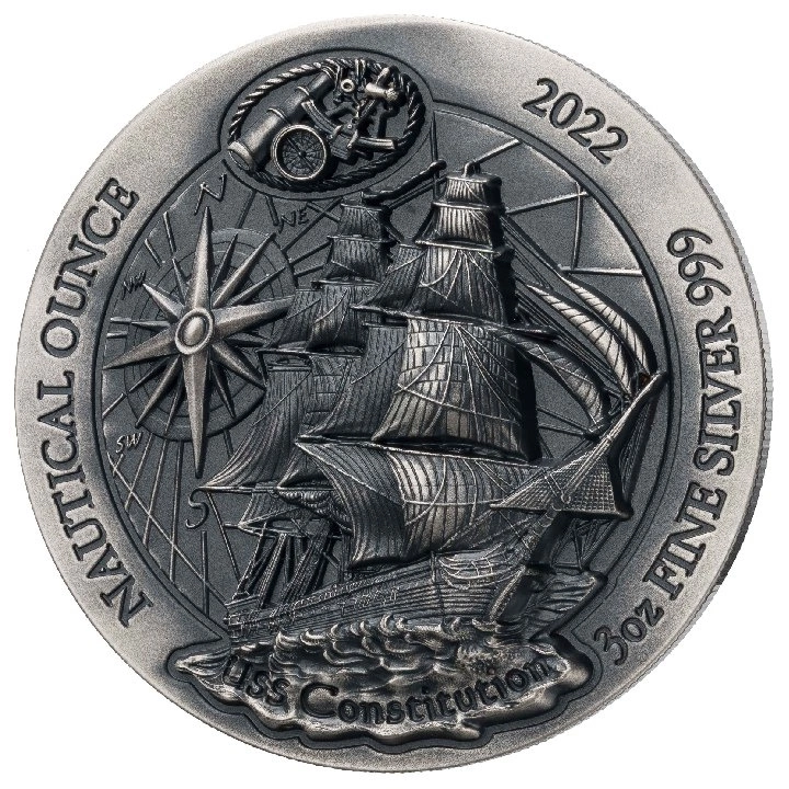 Rwanda: Nautical Ounce - USS Constitution 3 uncje Srebra 2022 Antique Finish unikalny produkt z serii "Nautical Ounce" przedstawiający amerykańską trójmasztową fregatę. Moneta bita jest z czystego srebra próby Ag.999, o wadze trzech uncji trojańskich, średnicy 60 mm, w standardzie antique finish.