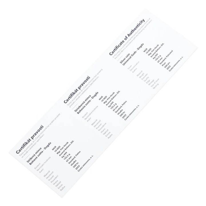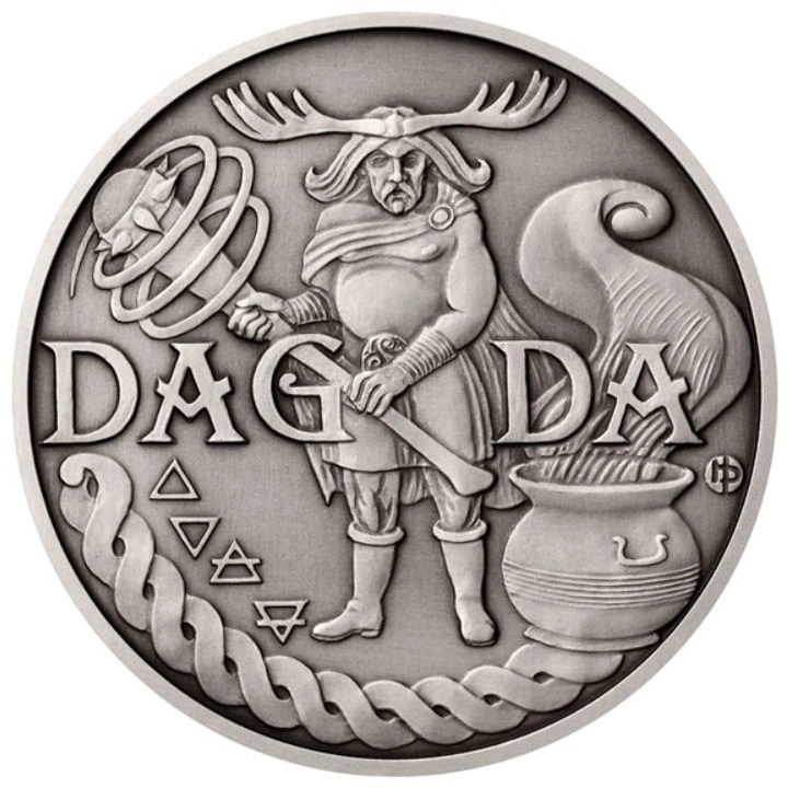 Moneta Niue: Universal Gods - Dagda 5 uncji Srebro 2022 jest kolejną monetą z serii "Universal Gods" upamiętniających starożytnych bogów z całego świata. Walor prezentuje Dagdę - główne bóstwo celtyckie występujące w mitologii iryjskiej. Jego imię oznacza "Dobry Bóg" lub "Dobra (w znaczeniu zręcznej) Ręka". Znany jest również jako Cera (Stwórca). Był bogiem druidów, rolnictwa, obfitości i płodności.