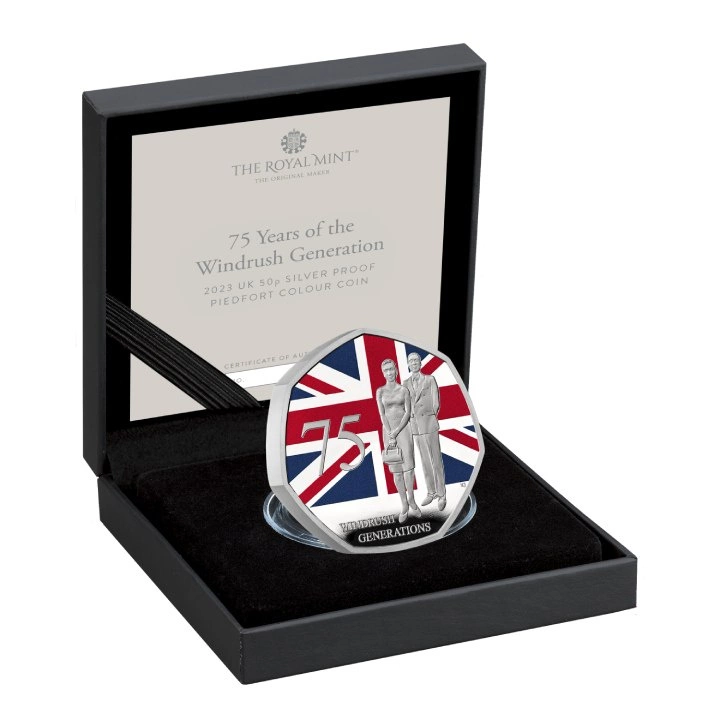 75 Years of the Windrush Generation kolorowany 50p Srebro 2023 Proof Piedfort to unikatowy walor upamiętniający 75 lat od przybycia wielu brytyjskich obywateli urodzonych poza granicami kraju, którzy przybyli do Wielkiej Brytanii w latach 1948-1973. Pokolenie pomogło odbudować powojenną Wielką Brytanię.