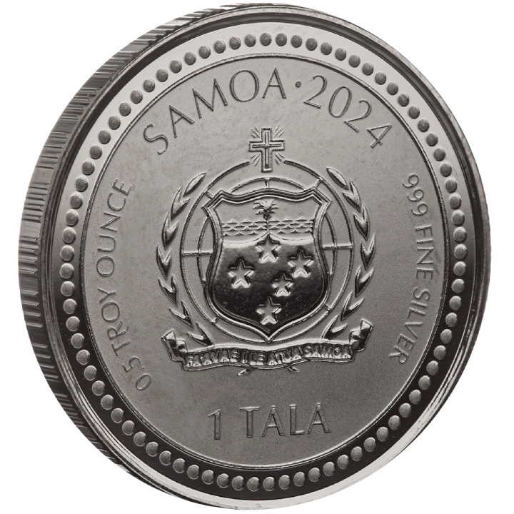 Awers srebrnej monety przedstawia herb wysp Samoa wraz z informacją o kraju emitenta, roku bicia, czystości kruszcu i wartości nominalnej.