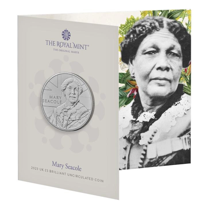 Mary Seacole £5 Miedzionikiel 2023 prezentuje działaczkę i wolontariuszkę - Mary Seacole, która zapewniła żołnierzom miejsce do regeneracji sił w trudnej rzeczywistości linii frontu podczas wojny krymskiej.