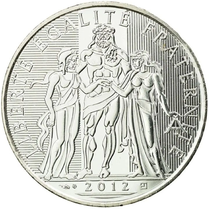Francja: Hercules 10 Euro Srebro 2012 to walor zaprojektowany przez Joaquin Jimenez o nominale 10 Euro. Moneta prezentuje Herkulesa pomiędzy alegoriami Wolności i Równości.