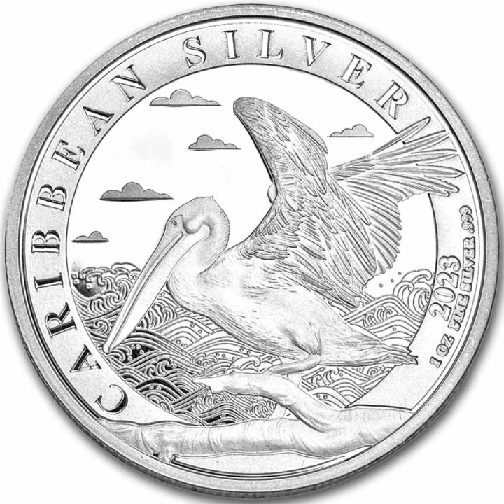 Moneta Barbados: Caribbean Pelican 1 uncja Srebra 2023 to unikatowy walor, który przedstawia pelikana brunatnego. Pelikan wraz z koryfeną są symbolicznymi zwierzętami, które znajdują się w herbie Barbados. Produkt jest 4 walorem z serii Caribbean Series.